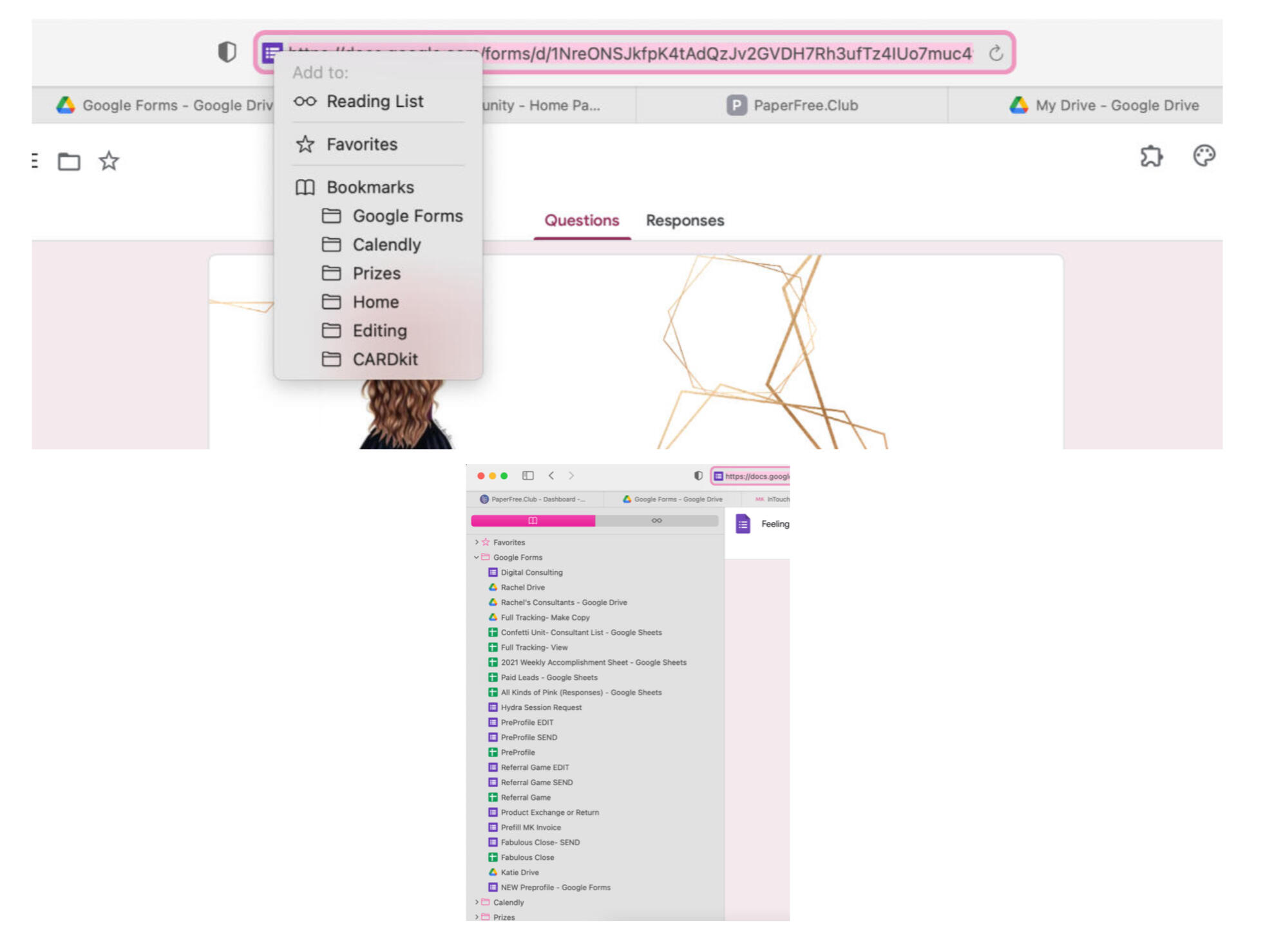 There are TWO types of links that are very very important to remember.#1 is the link to access the Google Form for Editing and viewing the Responses. Once you find the Google Form you want, open it. The URL to this page is very useful to save in your browser bookmarks for quick access to view the responses and edit any questions.