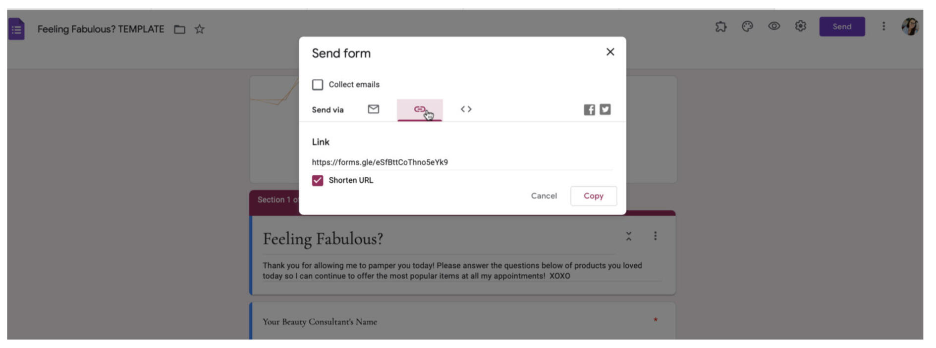 4. Click "COPY"This is the link you can send to anyone to one and complete your Google Form.