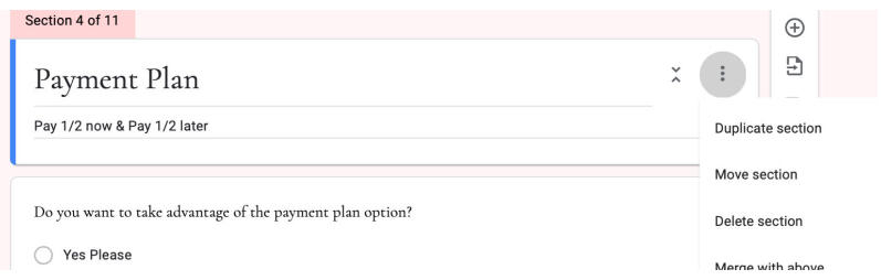 ⭐️** 2.** Section 4 of 11. Do you offer a payment plan? If so, leave it or adjust the wording to however you accept the payment plan. If you DO NOT offer payment plans, you can delete this section by clicking the triple dots and clicking "DELETE".